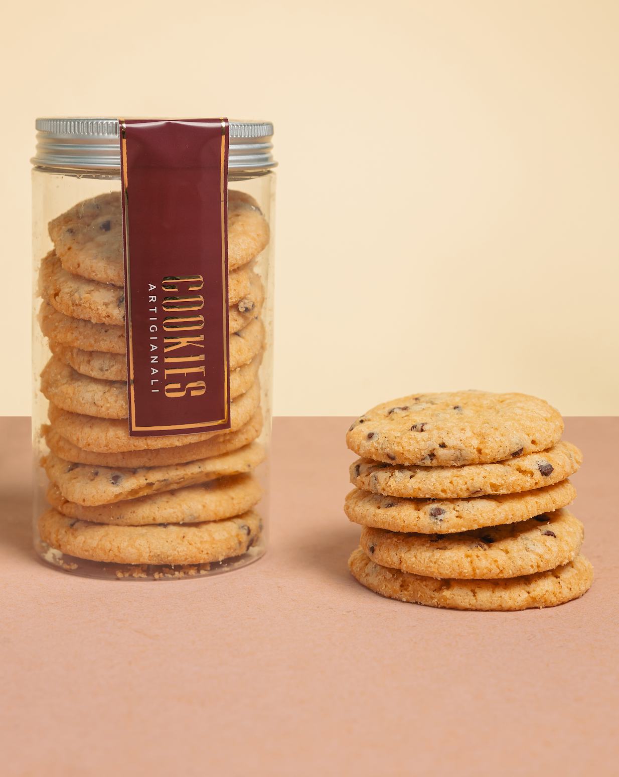 Friabili cookies con golose gocce di cioccolato fondente, racchiusi in barattolo.